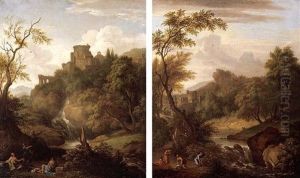 Classical Landscapes With Figures Resting Beside Cascades, Classical Buildings Beyond