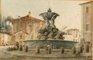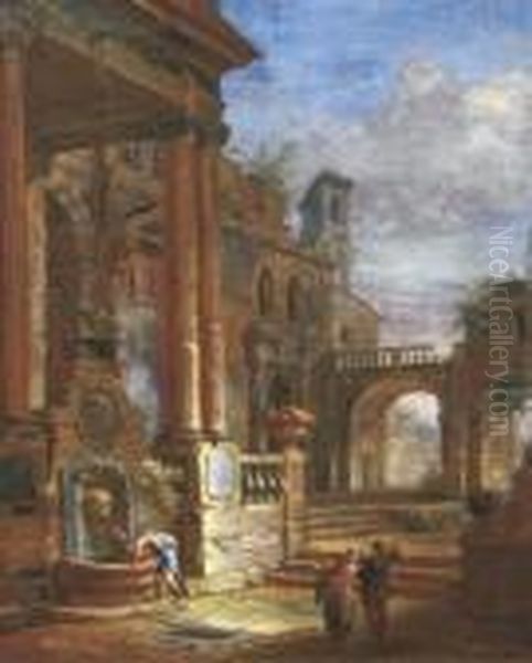 An Architectural Capriccio With Figures By A Fountain In A Square