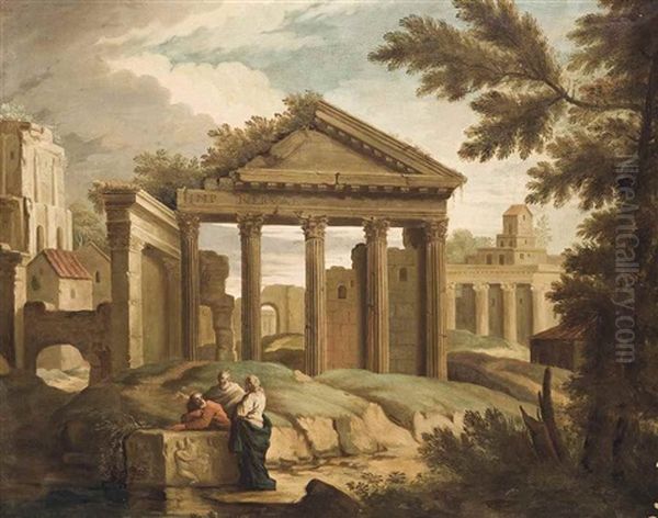 An Architectural Capriccio With Classical Figures On A Shore