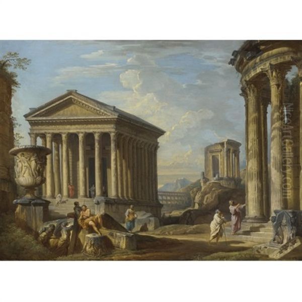 Capriccio Of Classical Ruins With The Maison Carree At Nimes, The Temple Of Vesta At Tivoli, The Pont Du Gard Near Nimes And The Borghese Vase
