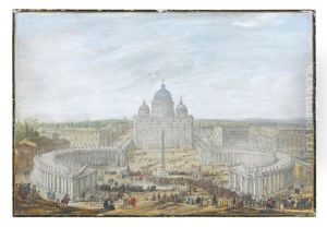 Bring the timeless beauty of Giovanni Paolo Panini's Interior Of Saint Peter's, Rome, Looking West Towards The Tomb Of St. Peter And The Baldacchino, With Pilgrims And Other Figures In The Nave into your home with a handmade oil painting reproduction. Carefully recreated on canvas by skilled artists using traditional techniques, this piece captures the delicate brushwork, subtle light, and vibrant color of the original masterpiece. With museum-level quality and rich texture, it brings elegance and artistic depth to any space. Enjoy free shipping and make this masterpiece a part of your personal collection.