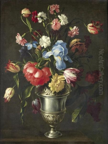 An Iris, A Peony, Love-in-a-mist, Tulips, Pinks And Other Flowers In A Silver Urn