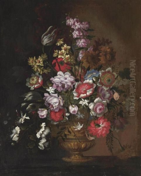 Poppies, Peonies, Tulips, Capers, Narcissi And Other Flowers In An Urn On A Ledge