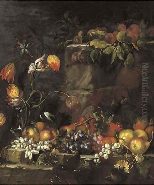 A glass vase with tulips, and apples, grapes, pears and other fruit on a stone ledge
