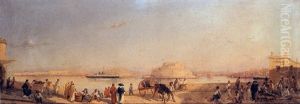 Figures Waiting At The Quay, Manoel Island, Malta, Fort Tigne Beyond