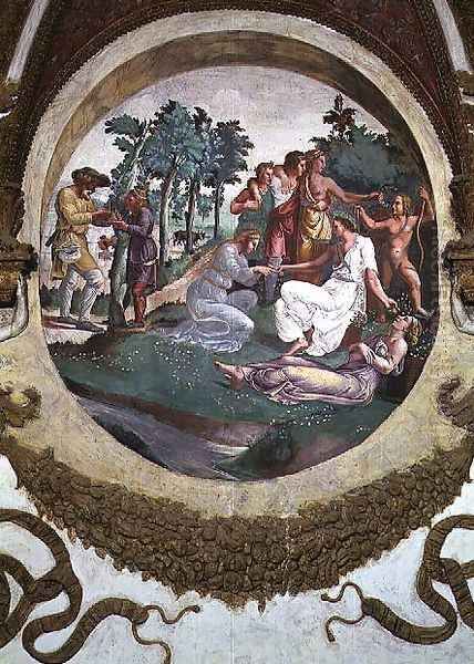 Scene showing that those born under the sign of Virgo in conjunction with the constellation of the Crown are bestowed with a love for flowers and gardens, symbolised by young people weaving garlands in a garden, from the Camera dei Venti, 1528