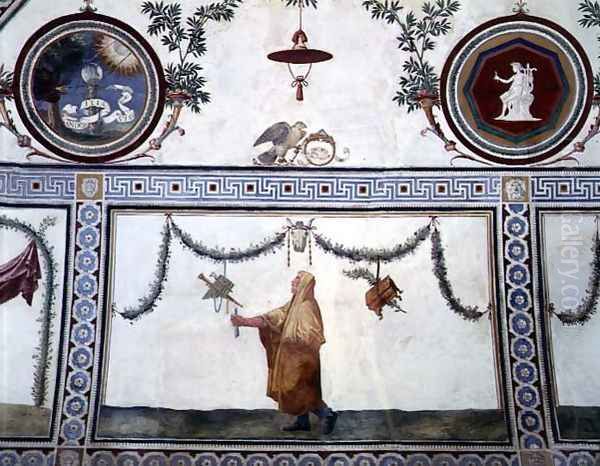 Bring the timeless beauty of Giulio Romano (Orbetto)'s The Camera con Fregio di Amorini Chamber of the Cupid Frieze detail of the ceiling depicting a robed man and insignia of the Medici family, 1520s into your home with a handmade oil painting reproduction. Carefully recreated on canvas by skilled artists using traditional techniques, this piece captures the delicate brushwork, subtle light, and vibrant color of the original masterpiece. With museum-level quality and rich texture, it brings elegance and artistic depth to any space. Enjoy free shipping and make this masterpiece a part of your personal collection.