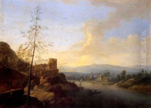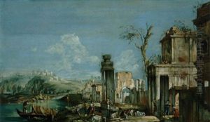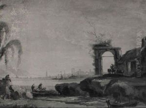 A Capriccio Lake Landscape With Ruins And Figures By A Well