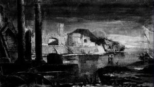 Veduta Di Citta Con Chiesa Ed Edificio Turrito, Con Figure E Imbarcazioni Fuori Dalle Mura