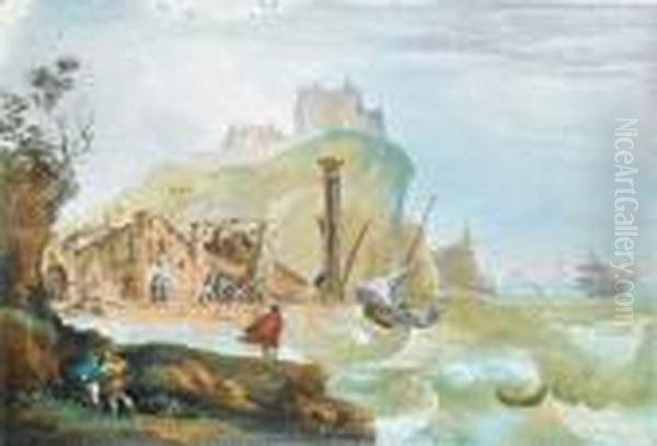 A Rocky Coastline With Shipping Foundering In Stormy Seas With Figures At A Harbour Looking On