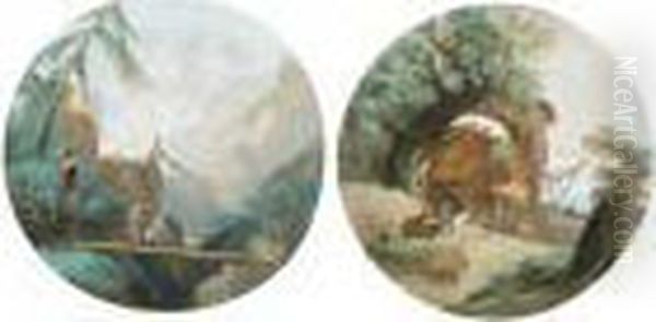 Paesaggio Alpino Con Due Viandanti E Un Cane Su Un Ponte; Paesaggio Con Un Borgo Rustico, Armenti E Viandanti