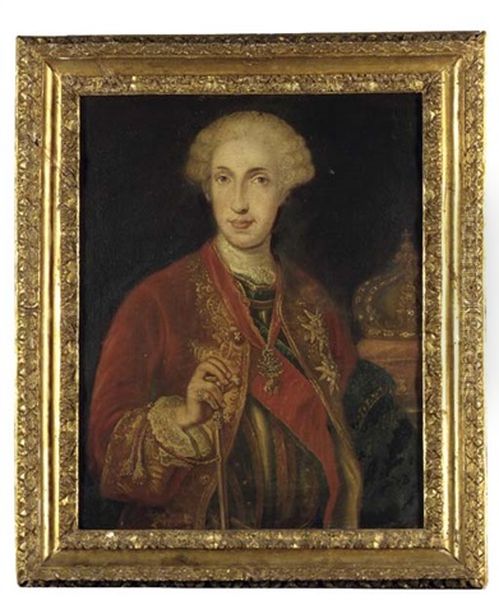 Portrait Of King Carlo Vii Of Naples, Subsequently King Carlos Iii Of Spain, In A Red Coat With Gold Trimmings Over A Breastplate, Wearing The Order Of The Golden Fleece, His Crown Beside Him