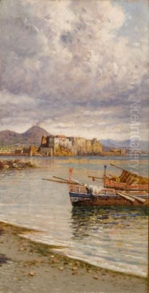 Napoli, Veduta Di Castel Dell""ovo E Del Vesuvio Dallaspiaggia Di Mergellina
