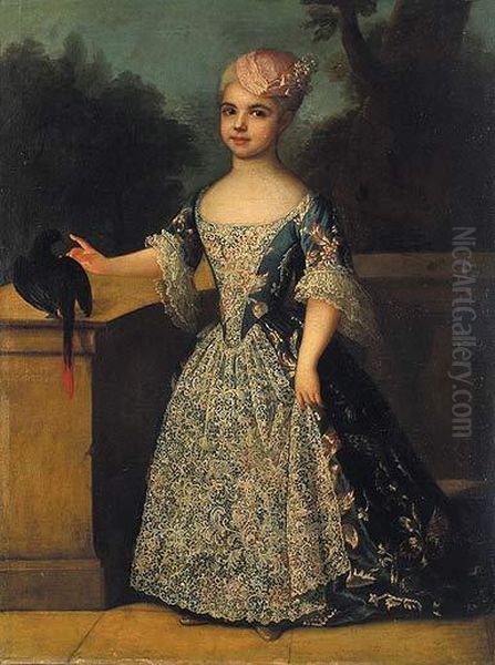 Retrato De Nina, De Cuerpo Entero, Ricamente Vestida En Una Terrraza Con Un Pajaro