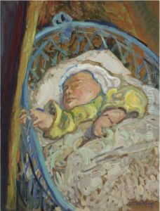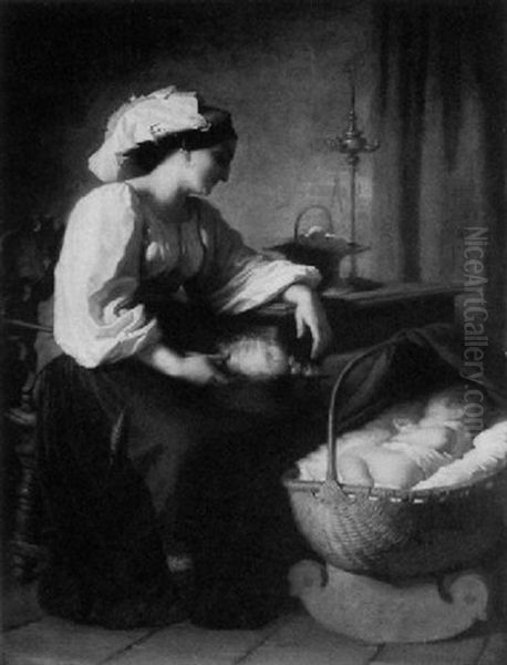 The Peaceful Slumber. Woman Holding A Distaff Watching A Sleeping Infant