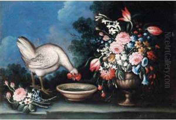 Still Life Of A Chicken Drinking From A Bowl, And A Bouquet Of Flowers In An Urn, Together In A Landscape
