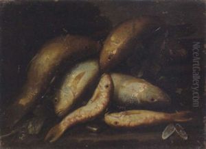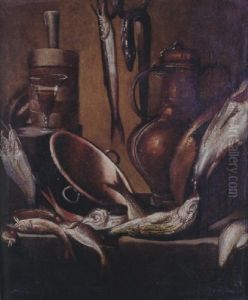 Still Life Of Salt Water Fish With Kitchen Vessels, Guarded By A Cat (+ Still Life Of Salt Water Fish And Squid In A Landscape; Pair)