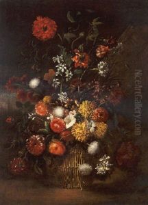 Tulips, Convolvulus, Carnations And Other Flowers In A Basket With A Silver-gilt Ewer And A Dish Of Sweetmeats On A Table-top Draped With Rugs