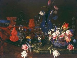 A Still Life Of Tulips, Roses, Anemones And Other Flowers In A Glass Vase On A Stone Plinth