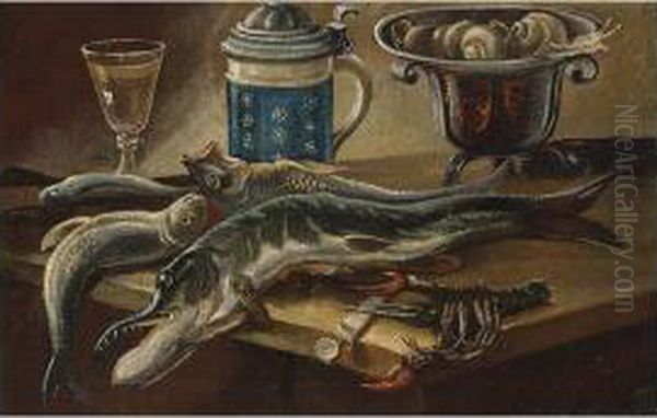 A Still Life Of Fish, Near A Wooden Tub, A Peeled Lemon And Onions, All On A Wooden Table; A Still Life Of Fish, A Lobster, A Glass, An Earthenware Jug And A Bowl Of Snails, All On A Table