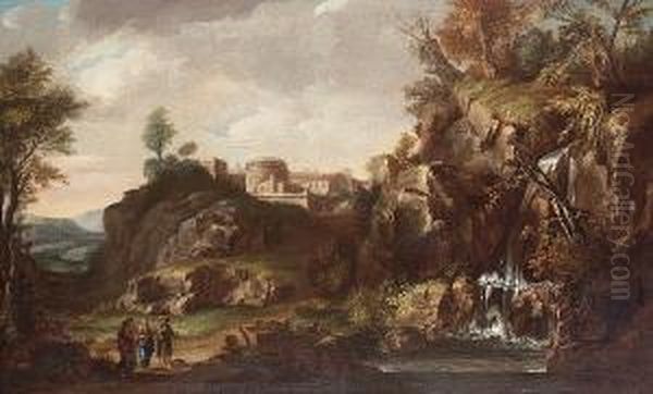 A Rocky River Landscape With Christ On The Road To Emmaus