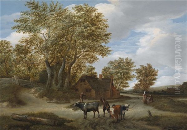 Landschaft Mit Einer Bauernkate Unter Baumen Und Landlicher Staffage