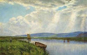 Landskab With Fisherman And Rowing Boats At The Edge Of A Lake