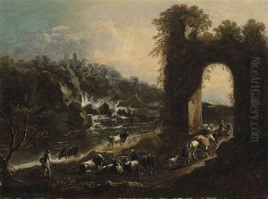 An Italianate Landscape With A Round, Blind Colonade Temple, Drovers With Their Cattle By Cascades And A Coastal Capriccio With A Ruined Tower (pair)