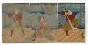 Toyokuni : Oban Tate-e ; Three Bijindressed Up As Sanbaso Dancers, The Print Entitled Furyu Onna Shikisanba [elegant Women's Sanbaso], They Represent The Men, Chichi Nojo, Okina And Sanbaso In The Shiki Sanba Ceremonial Dance, Signedtoyokuni Ga Wi