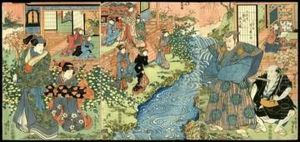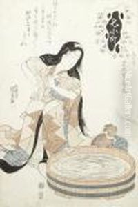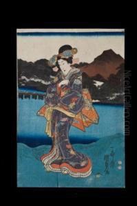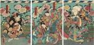 Toyokuni : Oban Tate-e ; Three Bijindressed Up As Sanbaso Dancers, The Print Entitled Furyu Onna Shikisanba [elegant Women's Sanbaso], They Represent The Men, Chichi Nojo, Okina And Sanbaso In The Shiki Sanba Ceremonial Dance, Signedtoyokuni Ga Wi