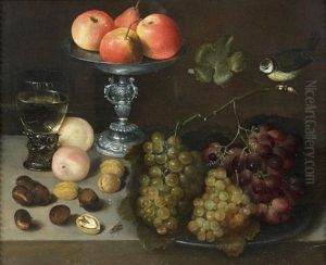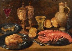 Nature Morte Au Plat D'olives, Romer Monte, Taza Presentant Des Biscuits, Verre De Vin, Poulet Roti Et Orange Sur Un Entablement