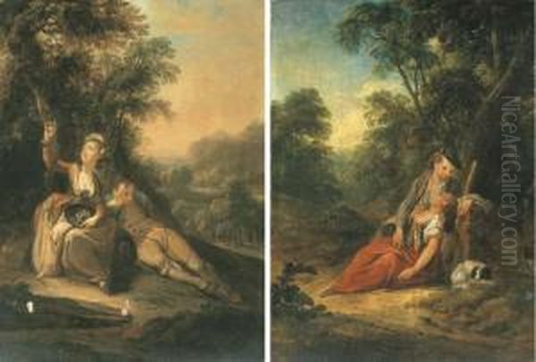 Un Musicien Et Une Bergere Endormie; Et Jeune Femme Jouant Avec Unnid D'oiseaux, Un Berger Endormi A Son Cote
