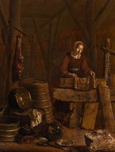 A Barn Interior With Four Cows, A Milk Maid Cleaning A Pot, And Earthenware Pots In The Foreground