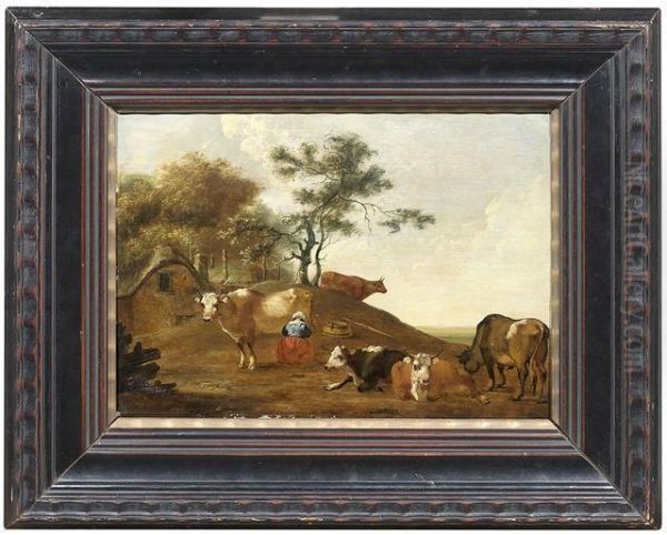 Kuhmelkende Frau Mit Ihrer Herde Vor Einer Bauernkate