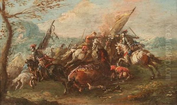 Pietro Zugeschrieben(italienischer Maler Des 18.jh., Sehr Haufig Schlachtenbilder)"schlachtenszene" Mit Zahlreichen Reitern, Ol Auf Kupferplatte, 12x 18,5, R.