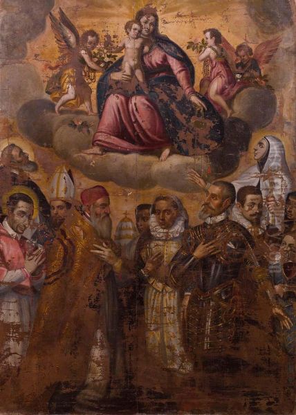 Madonna Del Rosario Col Bambino Alla Presenza Di San Carloborromeo E Due Santi,