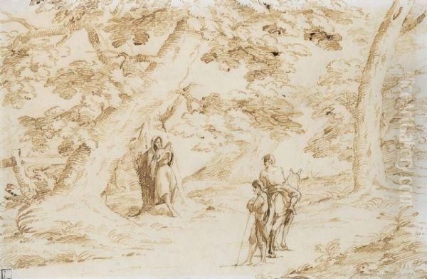 Baumbestandene Landschaft Mit Einem Eremiten Und Reisenden
