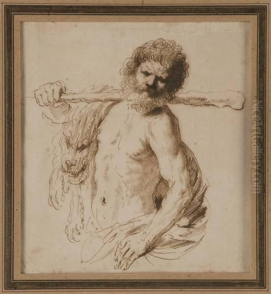 Hercule Portant Une Peau De Lion Ainsi Qu""un Baton, Plume Et Encre Brune Sur Papier. Par Il Guercino. Ecole Italienne (bologne). (dessin Preparatoire Pour Le Tableau Anciennement Dans La Collection Koeliker. On Y Joint Un Dossier D""etude Realise