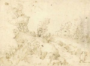 A Hilly Landscape With Travellers On A Road To The Right And Others With A Packhorse To The Left