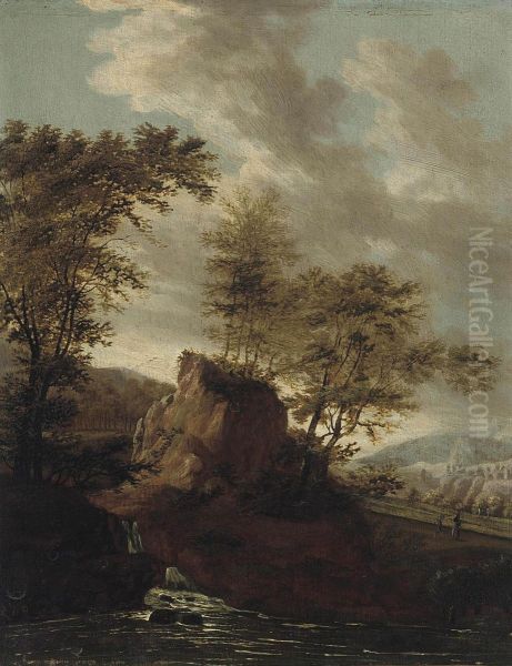 A Rocky River Landscape With Travellers On A Track