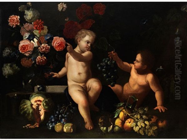Blumen- Und Fruchtestilleben Mit Zwei Knablein