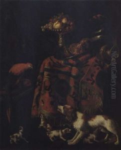 Stilleben Mit Fruchten, Einem Silbergefass, Hunden Und Einem Papagei