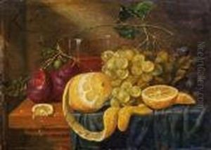 Oysters and a prawn on a pewter plate, a partly peeled lemon, plums, grapes and cherries on a partly draped table