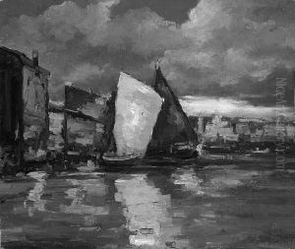 G. "segelboote Vor Einer Stadt". Sign. Ol Auf Lwd. Auf Karton. 27 X 31,5 Cm