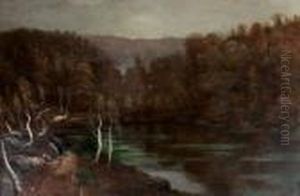 Paysage Lacustre Boise Aquarelle Gouachee Sur Trait De Crayon Noir