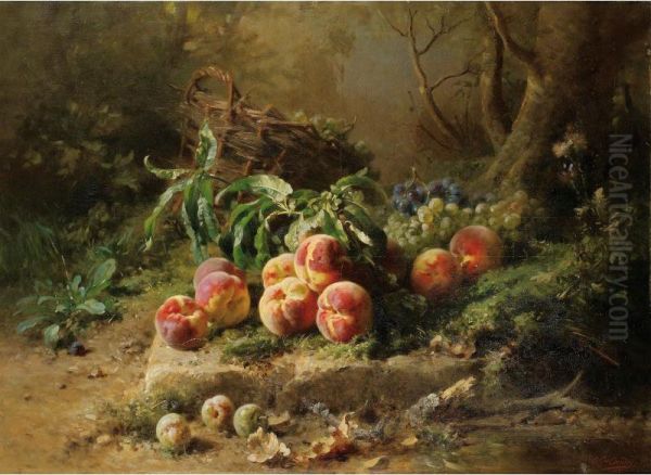 Peches Et Panier De Raisin Dans Un Sous-bois