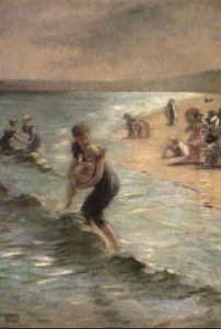 Beach Scene With Woman Painting At An Easel While A Child Is Playing