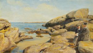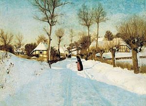 Winter day near a thatched house. A man is walking by on the snow covered road.