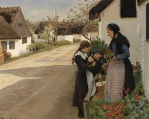 Mor Og Barn Ved Bondehuse, I Forgrunden Stokroser