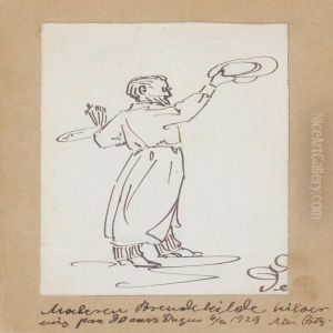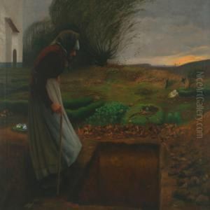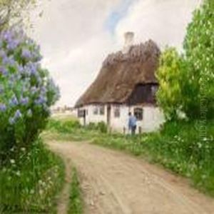 A Little Girl With A Cat And Chickens Near A Whitewashed Cottage With Thatched Roof